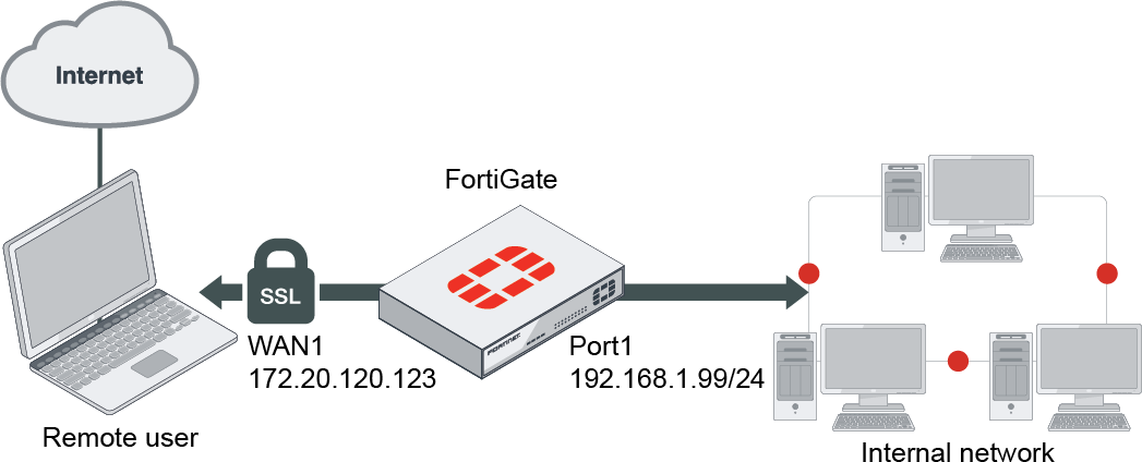config system interface edit "wan1" set vdom "root" set ip 172.20.120.123 255.255.255.0 next end - Configure internal interface and protected subnet, then connect the port1 interface to the internal network.