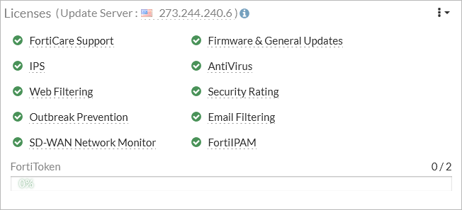 An SD‑WAN Network Monitor license is required to use the speedtest. The License widget and the System > FortiGuard page show the license status.