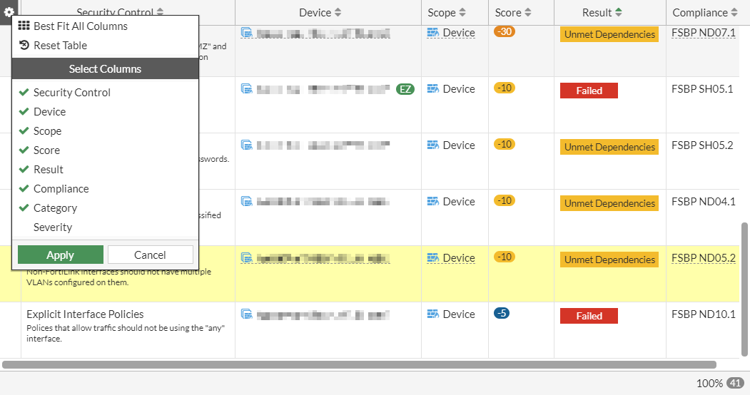 On the report scorecards, the Scope column shows the VDOMs that the check was run on. On checks that support Easy Apply, the remediation can be run on all of the associated VDOMs.