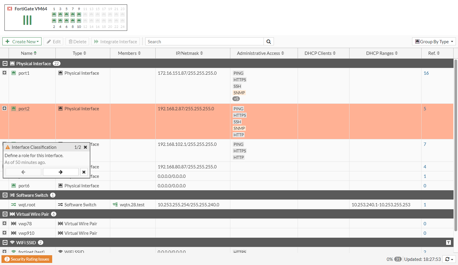 On the Network > Interfaces page, there is a Security Rating Issues section in the table footer. Click Security Rating Issues to view the list of issues. To dismiss a notification, click the X beside it. To view dismissed notifications, click Show Dismissed.
