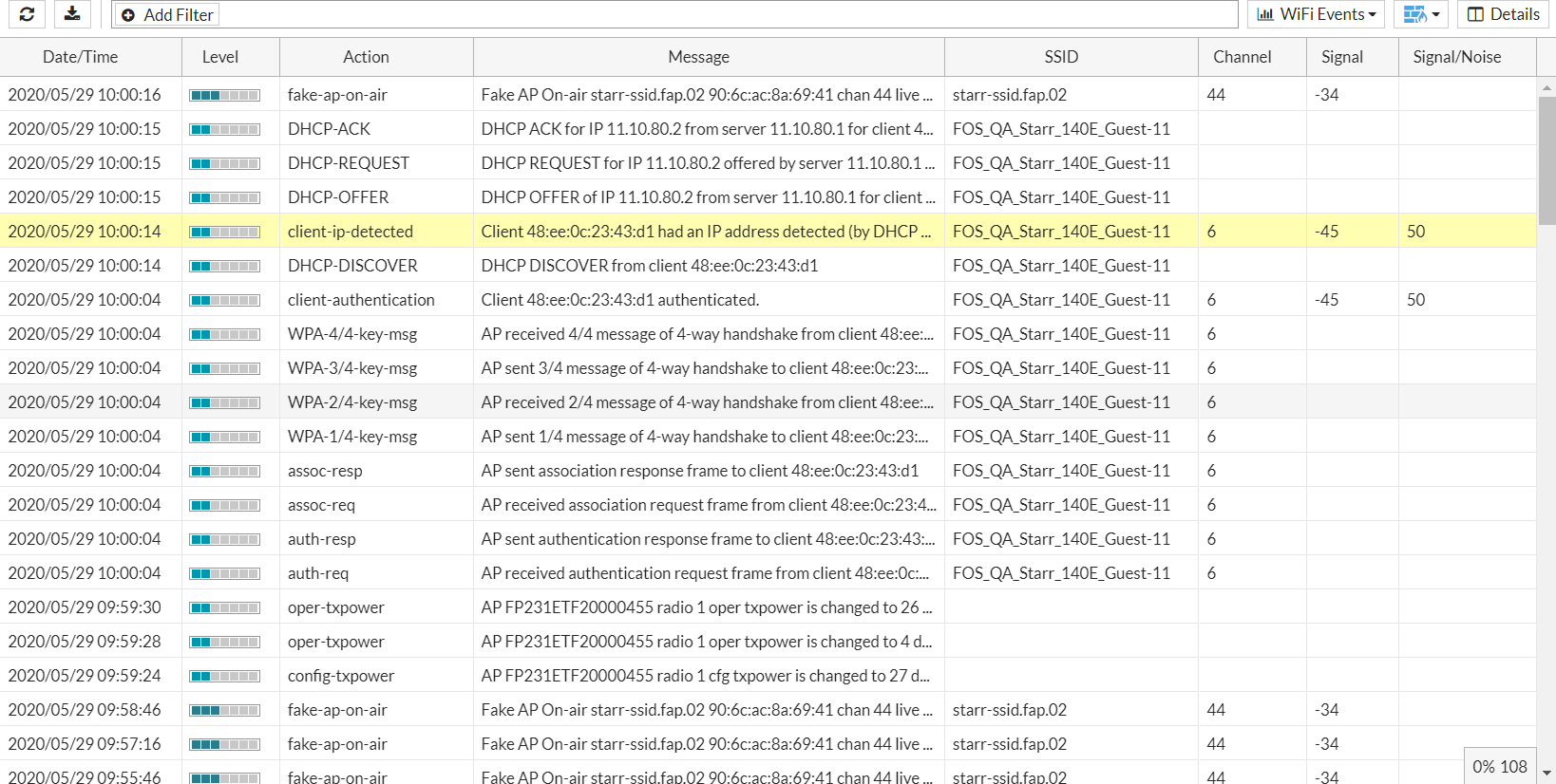 The signal-to-noise ratio (snr) and signal strength (signal) are logged per client in the WiFi event and traffic logs.
