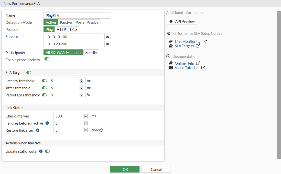 - Set Server to the IP addresses of up to two servers that all of the SD-WAN members in the performance SLA can reach.