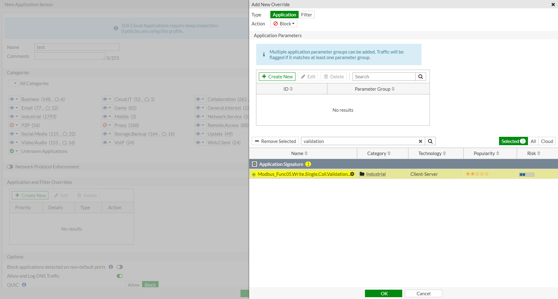 Application control signatures that support parameters (such as SCADA protocols) can have multiple parameters grouped together and matched at the same time. Multiple application parameter groups can be added to an override. Traffic will be flagged if it matches at least one parameter group.
