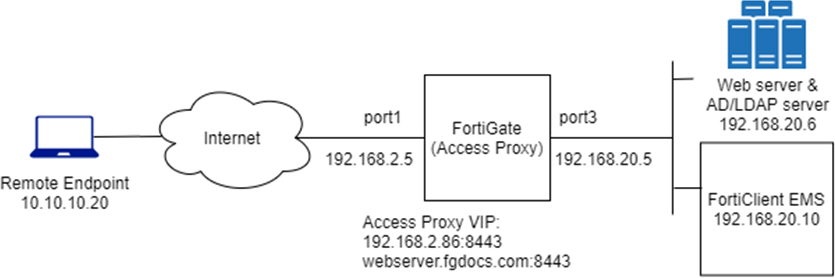 This example expands on the previous example (ZTNA HTTPS access proxy example), adding LDAP authentication to the ZTNA rule. Users are allowed based on passing the client certificate authentication check, user authentication, and security posture check.