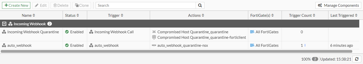 config system automation-trigger edit "auto_webhook" set trigger-type event-based set event-type incoming-webhook next endconfig system automation-action edit "auto_webhook_quarantine-nsx" set action-type quarantine-nsx set security-tag "automation_tag" set sdn-connector "nsx_t25" next endconfig system automation-stitch edit "auto_webhook" set trigger "auto_webhook" config actions edit 1 set action "auto_webhook_quarantine-nsx" set required enable next end next end - In NSX-T, create a cURL request to trigger the automation stitch on the FortiGate: