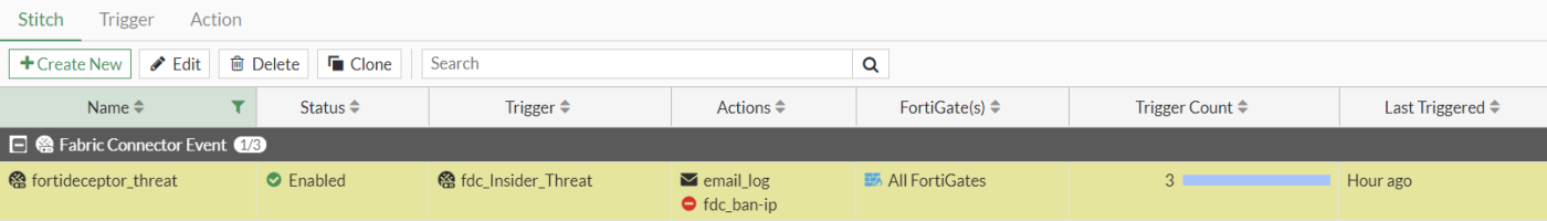 Three stitches are configured, one for each FortiDeceptor trigger type: