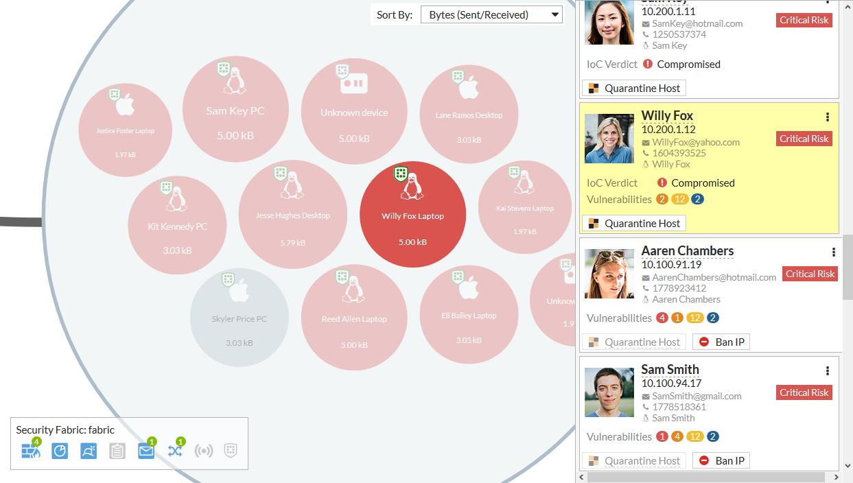 For each endpoint, the user's photo, name, IP address, email address, and phone number are shown. The number of vulnerabilities of each severity is shown, and if the IoC verdict is that the endpoint is compromised.