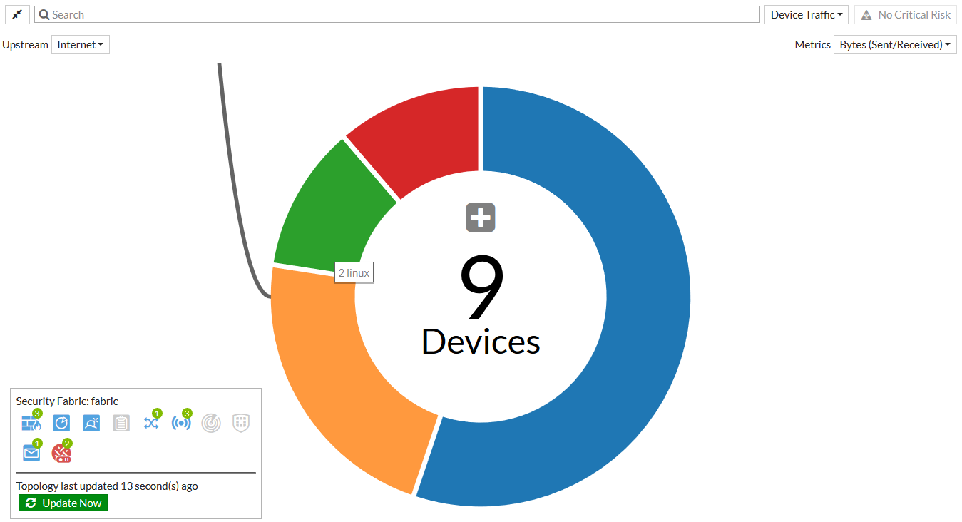 The full Security Fabric topology can be viewed on the root FortiGate. Downstream FortiGate devices' topology views do not include upstream devices.
