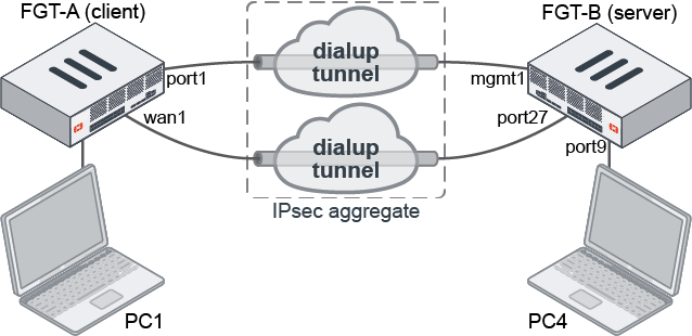 In this example, an IPsec aggregate tunnel is formed between two dial-up IPsec tunnels in order to support per-packet load balancing.