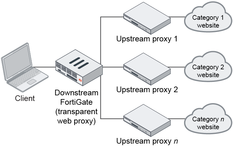 Once configured, the FortiGate forwards traffic generated by a client to the upstream proxy. The upstream proxy then forwards it to the server.