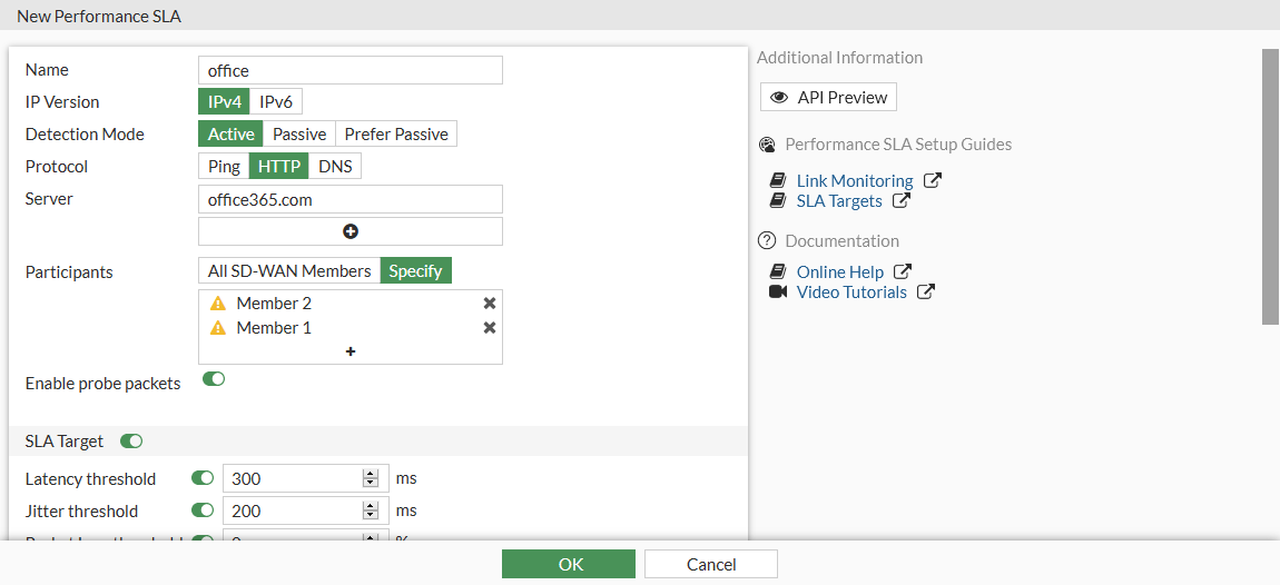 In this example, we create a template with two SD-WAN members configured without assigned interfaces that are used in a performance SLA and SD-WAN rule. The template can be used to configure new devices, as in Example 2. Interfaces are then assigned to the members, and the configuration becomes active.