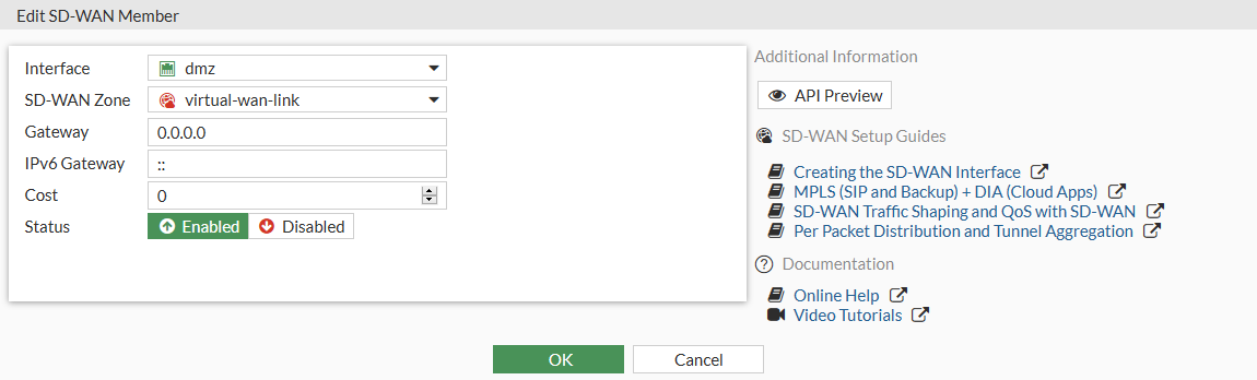 If the interfaces do not exist, the SD-WAN members are created without interfaces, and are disabled until interfaces are configured.