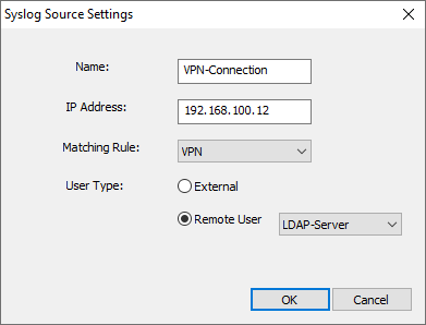 Remote User: Users are defined on a remote LDAP server and user groups are retrieved from the specified LDAP server. Any group from the syslog messages are ignored. See Connect to a remote LDAP server .