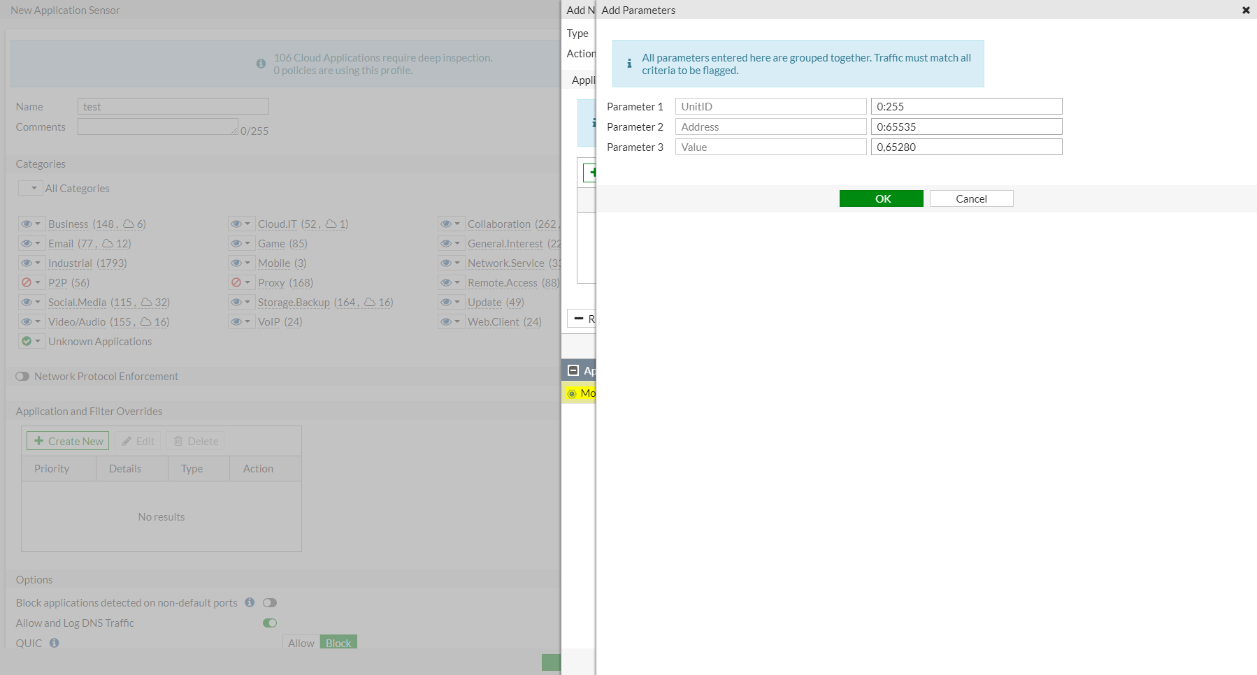 Application control signatures that support parameters (such as SCADA protocols) can have multiple parameters grouped together and matched at the same time. Multiple application parameter groups can be added to an override. Traffic will be flagged if it matches at least one parameter group.