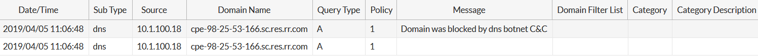 (global) # execute log filter category utm-dns (global) # execute log display 2 logs found. 2 logs returned. 1: date=2019-04-05 time=11:06:48 logid="1501054600" type="utm" subtype="dns" eventtype="dns-response" level="warning" vd="vdom1" eventtime=1554487606 policyid=1 sessionid=55232 srcip=10.1.100.18 srcport=60510 srcintf="port10" srcintfrole="undefined" dstip=172.16.95.16 dstport=53 dstintf="port9" dstintfrole="undefined" proto=17 profile="demo" xid=16265 qname="cpe-98-25-53-166.sc.res.rr.com" qtype="A" qtypeval=1 qclass="IN" ipaddr="93.184.216.34" msg="Domain was blocked by dns botnet C&C" action="redirect" botnetip=98.25.53.166 2: date=2019-04-05 time=11:06:48 logid="1500054000" type="utm" subtype="dns" eventtype="dns-query" level="information" vd="vdom1" eventtime=1554487606 policyid=1 sessionid=55232 srcip=10.1.100.18 srcport=60510 srcintf="port10" srcintfrole="undefined" dstip=172.16.95.16 dstport=53 dstintf="port9" dstintfrole="undefined" proto=17 profile="demo" xid=16265 qname="cpe-98-25-53-166.sc.res.rr.com" qtype="A" qtypeval=1 qclass="IN"