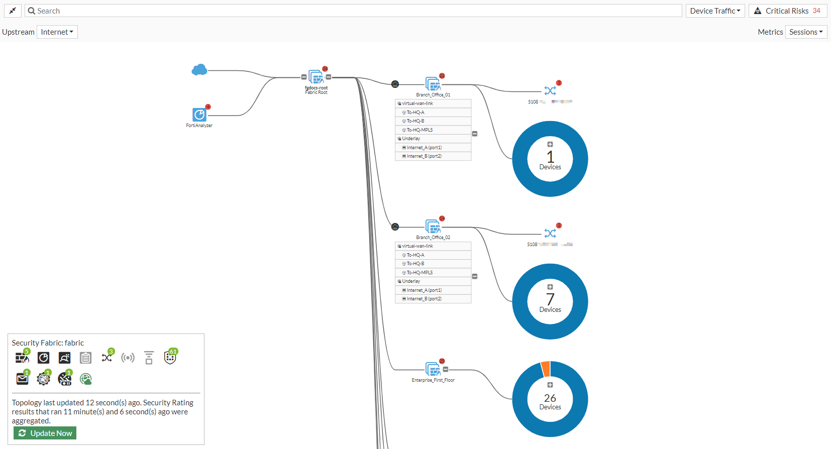 The full Security Fabric topology can be viewed on the root FortiGate. Downstream FortiGate devices' topology views do not include upstream devices.