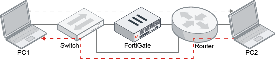 - The ICMP request bypasses the FortiGate, but it reaches PC1.