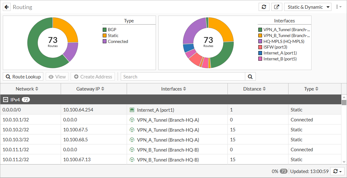 Route look-up on the other hand provides a utility for you to enter criteria such as Destination, Destination Port, Source, Protocol and/or Source Interface, in order to determine the route that a packet will take. Once you click Search, the corresponding route will be highlighted.