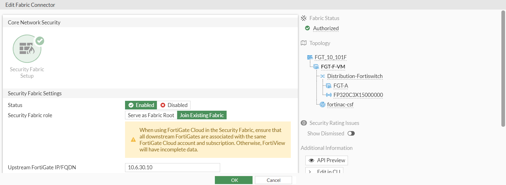 - Click OK. The FortiGate is authorized and successfully joins the Security Fabric.