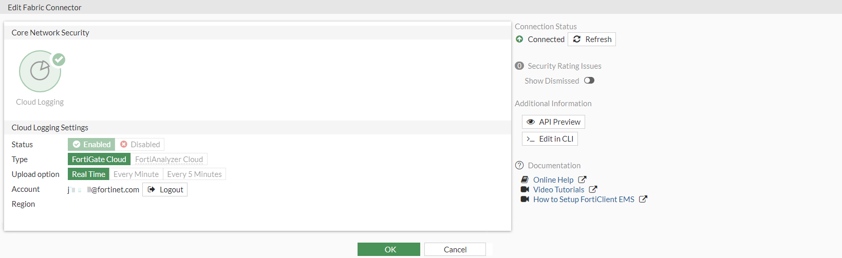 - Go to Security Fabric > Fabric Connectors and double-click the Cloud Logging card. The settings are automatically retrieved from the root and the Account is the same.