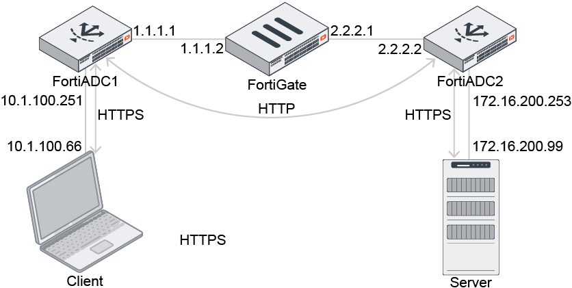 The client sends HTTPS traffic to ADC1, which then decrypts the traffic and sends HTTP to the FortiGate. The FortiGate forwards HTTP to ADC2, and the ADC2 re-encrypts the traffic to HTTPS.