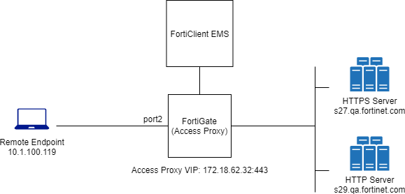 2. The virtual IP mapped to the FQDN address is not the real address of the server. It allows applications to resolve the FQDN address to this virtual IP. FortiClient listens to any traffic destined for it and forwards the traffic using the TCP forwarding URL with FQDN to the ZTNA access proxy.