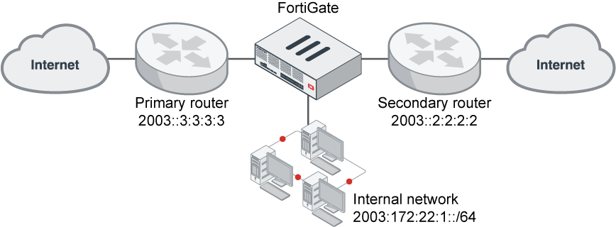 • When the FortiGate does not learn route 2003:17:28:1::/64 from the primary router, advertises its local route (2003:172:22:1::/64) to the secondary router.