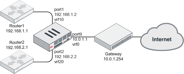 FortiGate can establish neighbor connections with other FortiGates or routers, and the learned routes are put into different VRF tables according to the neighbor's settings.