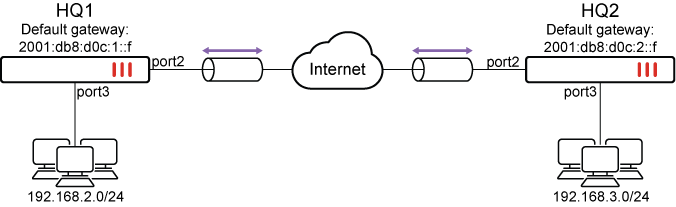 • HQ1 port2 IPv6 address is 2001:db8:d0c:1::e and port3 IPv4 address is 192.168.2.1.