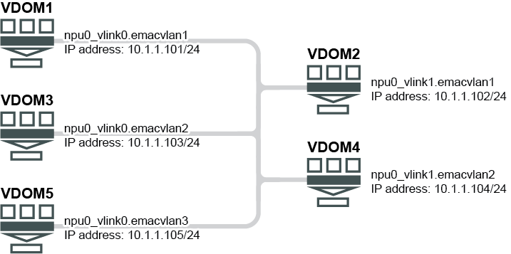 In this example, multiple VDOMs can connect to each other using enhanced MAC VLAN on network processing unit (NPU) virtual link (Vlink) interfaces.