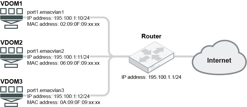 In this example, a FortiGate is connected, through port 1 to a router that’s connected to the Internet. Three VDOMs share the same interface (port 1) which connects to the same router that’s connected to the Internet. Three enhanced MAC VLAN interfaces are configured on port 1 for the three VDOMs. The enhanced MAC VLAN interfaces are in the same IP subnet segment and each have unique MAC addresses.