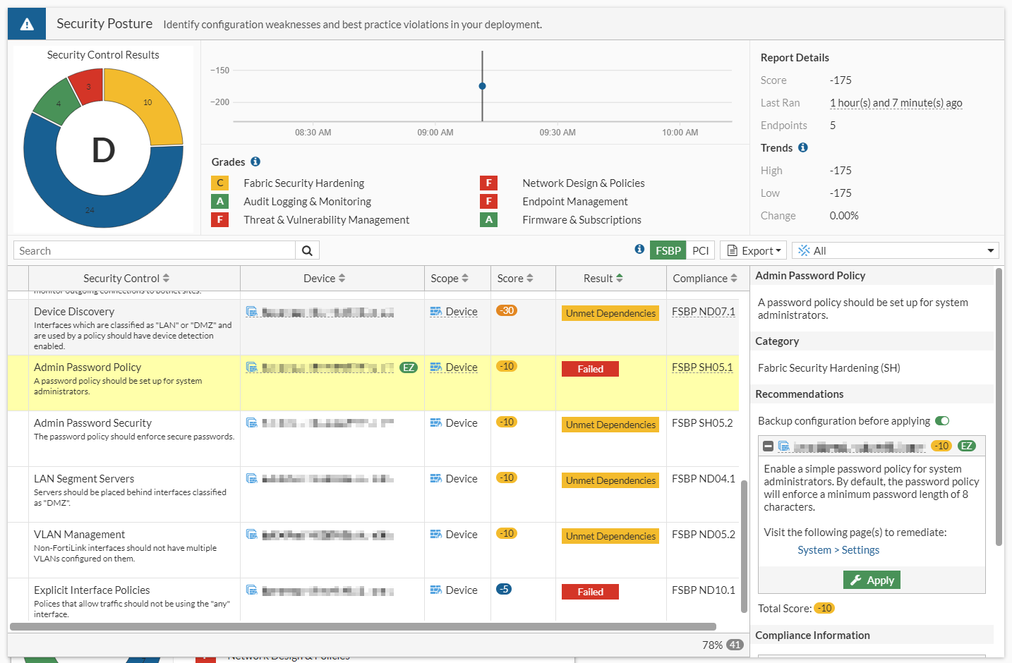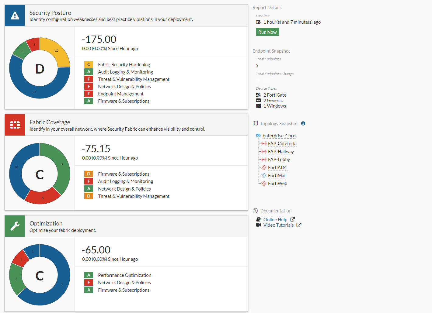The security rating uses real-time monitoring to analyze your Security Fabric deployment, identify potential vulnerabilities, highlight best practices that can be used to improve the security and performance of your network, and calculate Security Fabric scores.