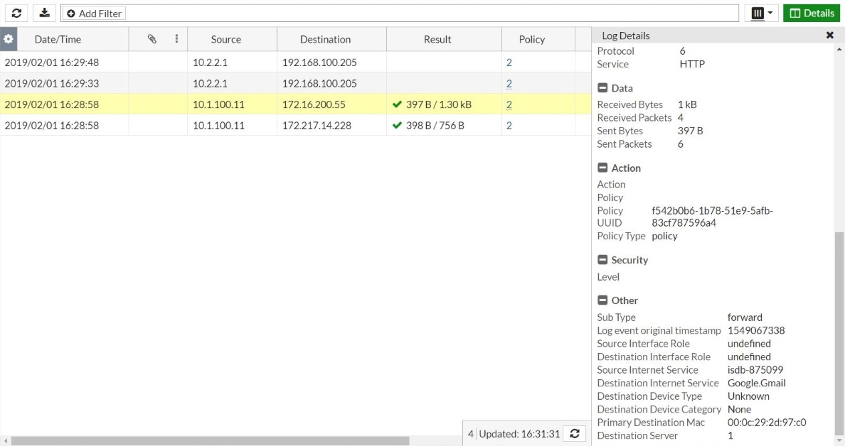 date=2019-01-25 time=14:17:04 logid="0000000013" type="traffic" subtype="forward" level="notice" vd="vdom1" eventtime=1548454622 srcip=10.1.100.11 srcport=51112 srcintf="port3" srcintfrole="undefined" dstip=172.217.14.228 dstport=80 dstintf="port1" dstintfrole="undefined" poluuid="af519380-2094-51e9-391c-b78e8edbddfc" srcinetsvc="isdb-875099" dstinetsvc="Google.Gmail" sessionid=6930 proto=6 action="close" policyid=2 policytype="policy" service="HTTP" dstcountry="United States" srccountry="Reserved" trandisp="snat" transip=172.16.200.2 transport=51112 duration=11 sentbyte=398 rcvdbyte=756 sentpkt=6 rcvdpkt=4 appcat="unscanned" devtype="Router/NAT Device" devcategory="Fortinet Device" mastersrcmac="90:6c:ac:41:7a:24" srcmac="90:6c:ac:41:7a:24" srcserver=0 dstdevtype="Unknown" dstdevcategory="Fortinet Device" masterdstmac="08:5b:0e:1f:ed:ed" dstmac="08:5b:0e:1f:ed:ed" dstserver=0