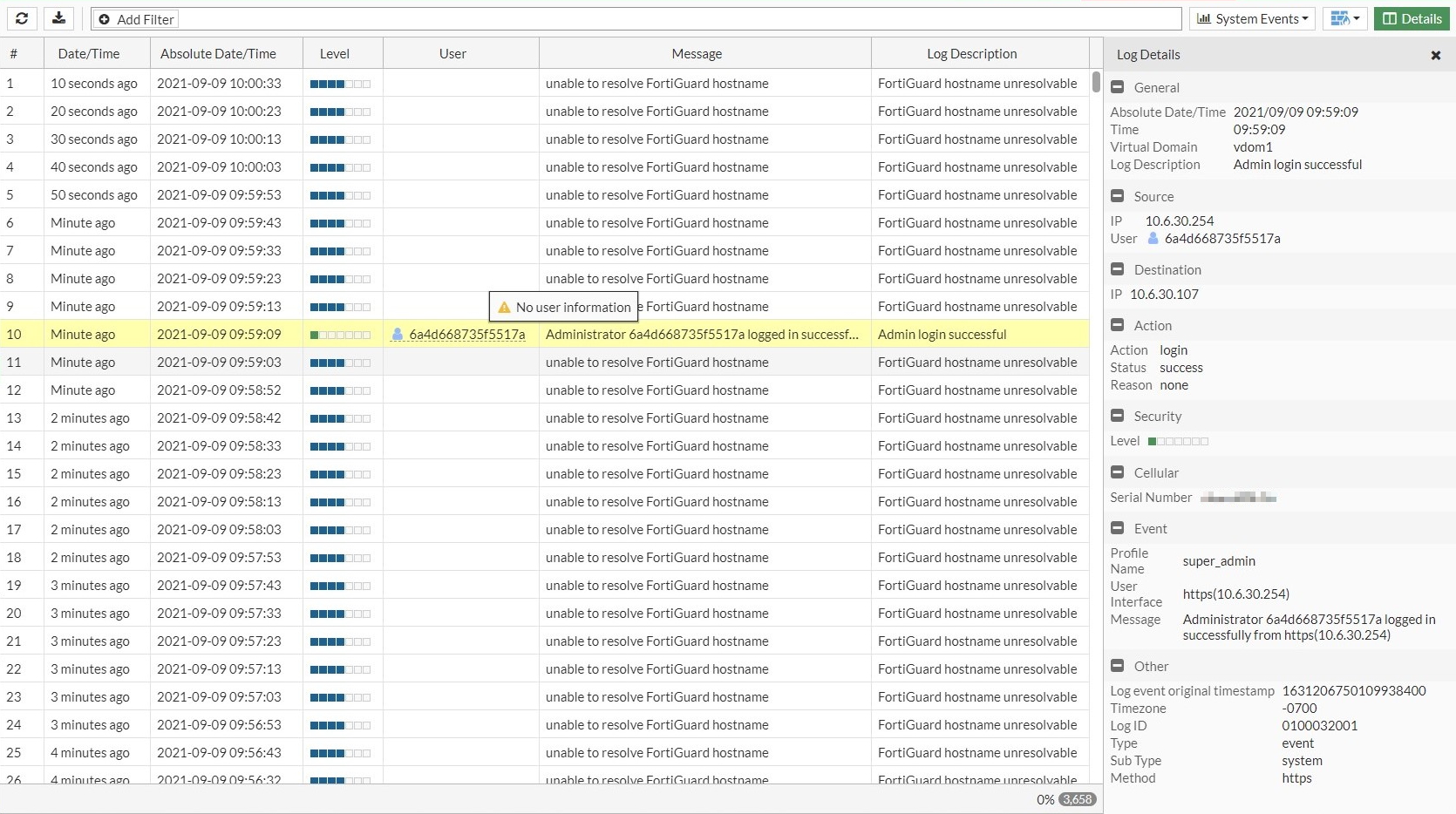 date=2021-09-09 time=09:59:09 eventtime=1631206750109938510 tz="-0700" logid="0100032001" type="event" subtype="system" level="information" vd="vdom1" logdesc="Admin login successful" sn="**********" user="6a4d668735f5517a" ui="https(10.6.30.254)" method="https" srcip=10.6.30.254 dstip=10.6.30.107 action="login" status="success" reason="none" profile="super_admin" msg="Administrator 6a4d668735f5517a logged in successfully from https(10.6.30.254)"