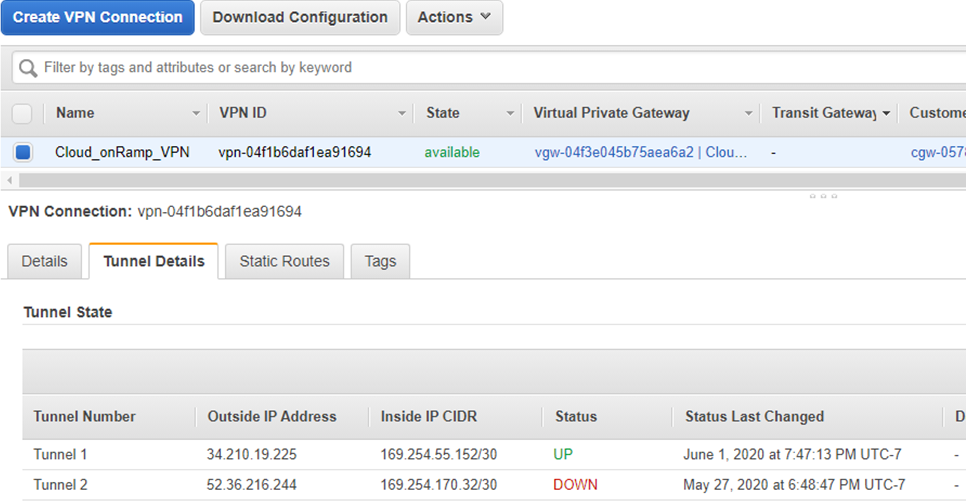 AWS site-to-site VPN always creates two VPN tunnels for redundancy. In this example, only Tunnel 1 is used.