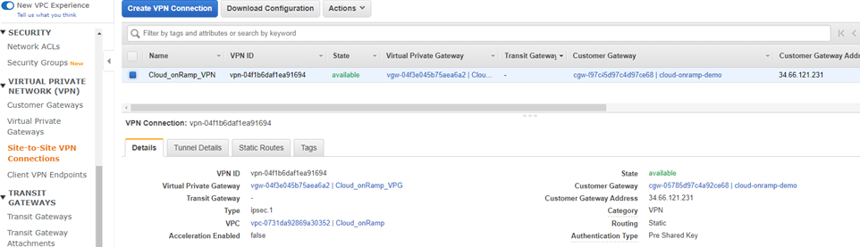 - Go to Virtual Private Network (VPN) > Site-to-Site VPN Connections to confirm that site-to-site VPN connections have been created and attached to the customer gateway and virtual private gateway.