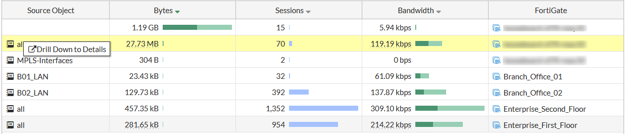 1. Open the FortiView Source Firewall Objects or FortiView Destination Firewall Objects monitor.