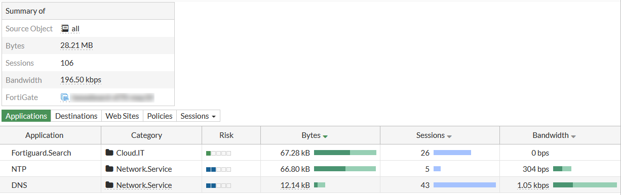 3. Click the tabs to sort the sessions by Application, Destinations, Web Sites, or Policies.