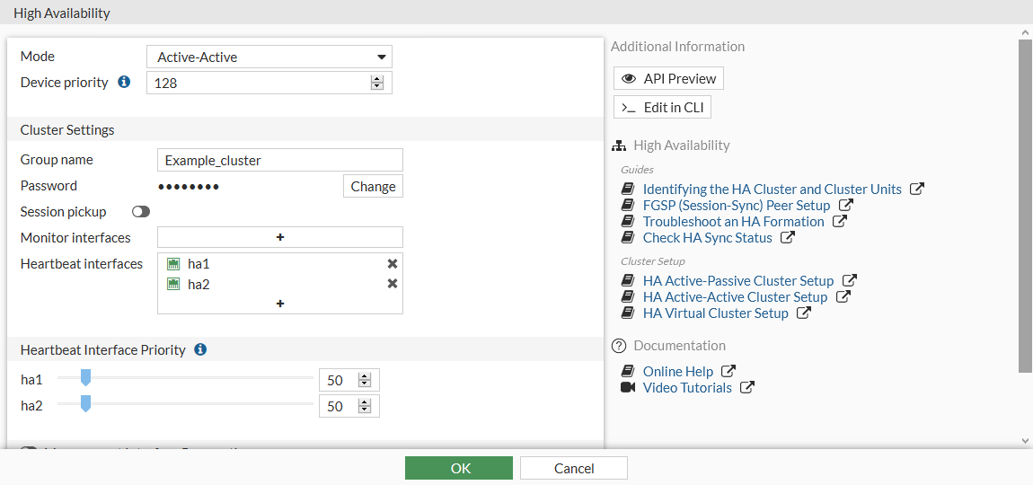 config system ha set mode a-a set group-name Example_cluster set hbdev ha1 10 ha2 20 end - Leave the remaining settings as their default values. They can be changed after the cluster is in operation.