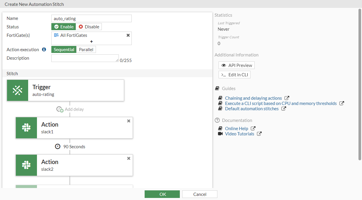 config system automation-stitch edit "auto_rating" set trigger "auto-rating" config actions edit 1 set action "slack1" set required enable next edit 2 set action "slack2" set delay 90 set required enable next end next end - Verify that the automation action was triggered:
