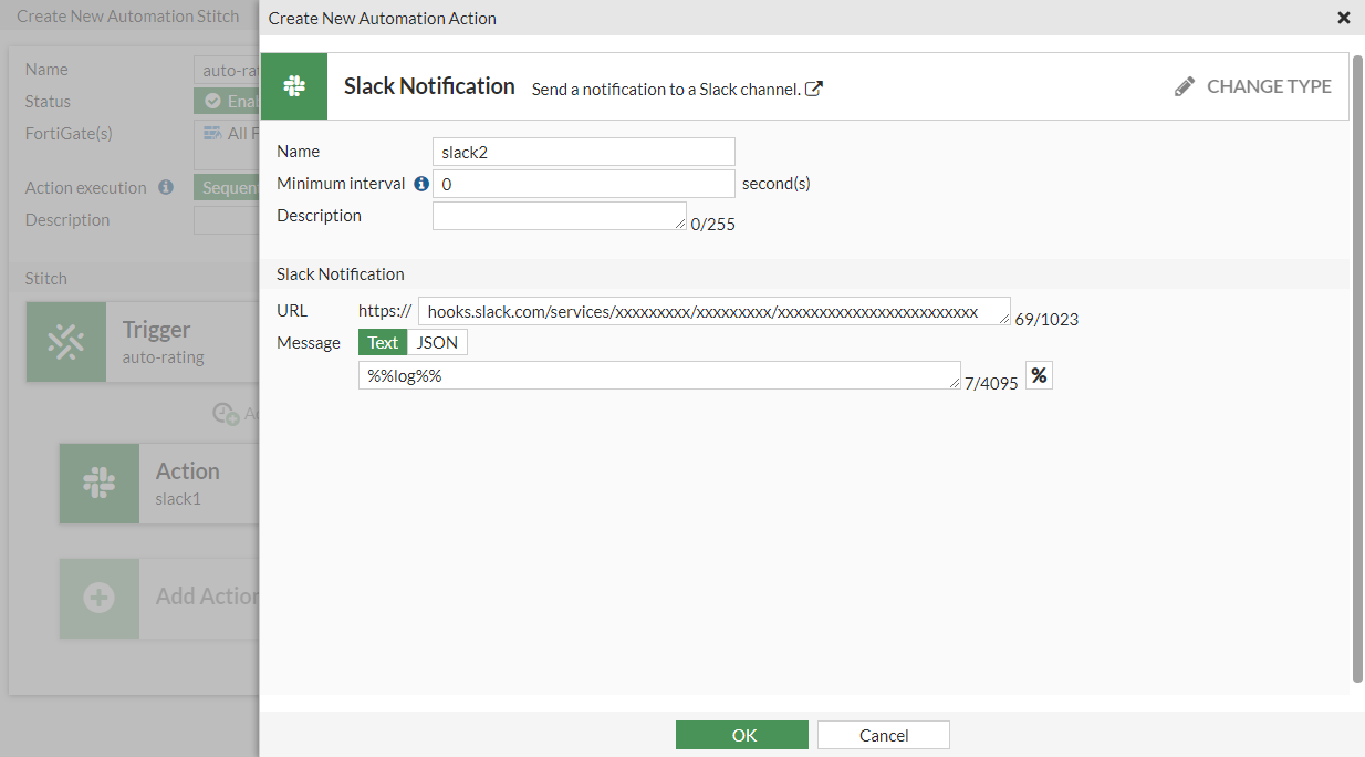 config system automation-action edit "slack1" set action-type slack-notification set message "This is test for slack notification." set uri "hooks.slack.com/services/xxxxxxxxx/xxxxxxxxx/xxxxxxxxxxxxxxxxxxxxxxxx" next edit "slack2" set action-type slack-notification set uri "hooks.slack.com/services/xxxxxxxxx/xxxxxxxxx/xxxxxxxxxxxxxxxxxxxxxxxx" next end - Configure the automation stitch:
