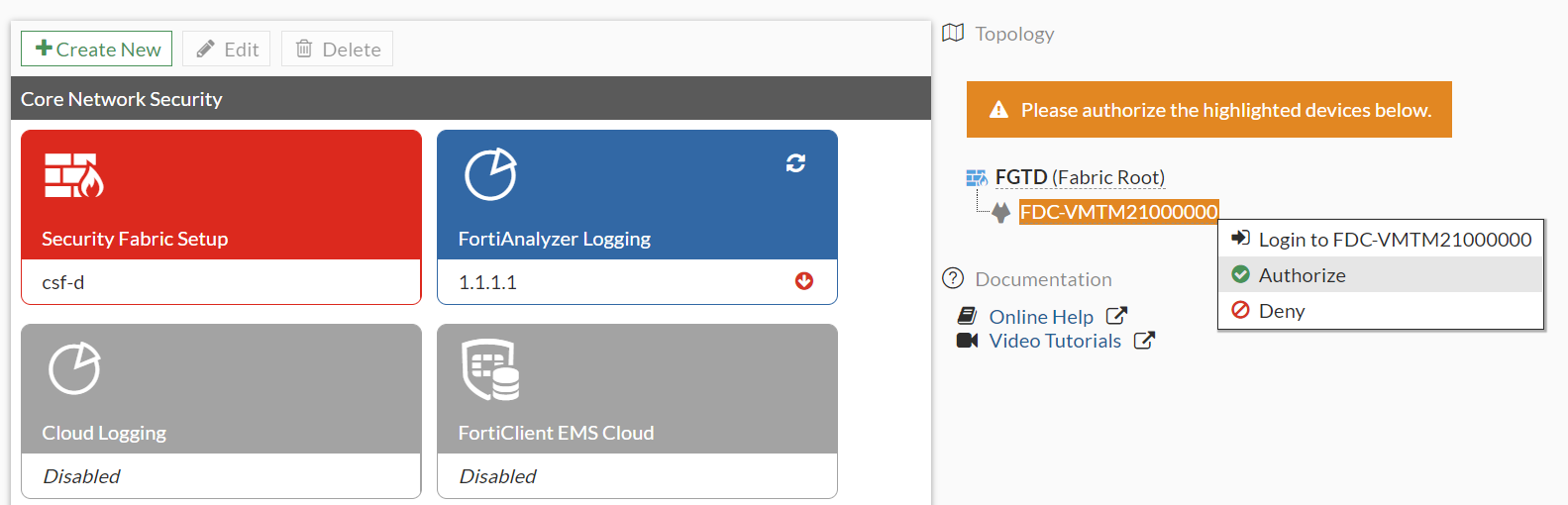 - In the topology tree, click the highlighted FortiDeceptor serial number and select Authorize.