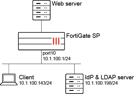 In this configuration, SAML authentication is used with an explicit web proxy. The IdP is a Windows 2016 server configured with ADFS. The LDAP and IdP servers are on the same server. The LDAP server is used as the user backend for the IdP to perform authentication; however, they are not required to be on the same server.