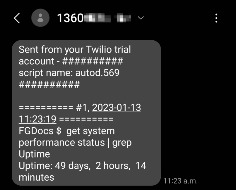 This triggers the automation stitch on the FortiGate to send a HTTP POST request to Twilio. In response, Twilio sends an SMS text message to the recipient.