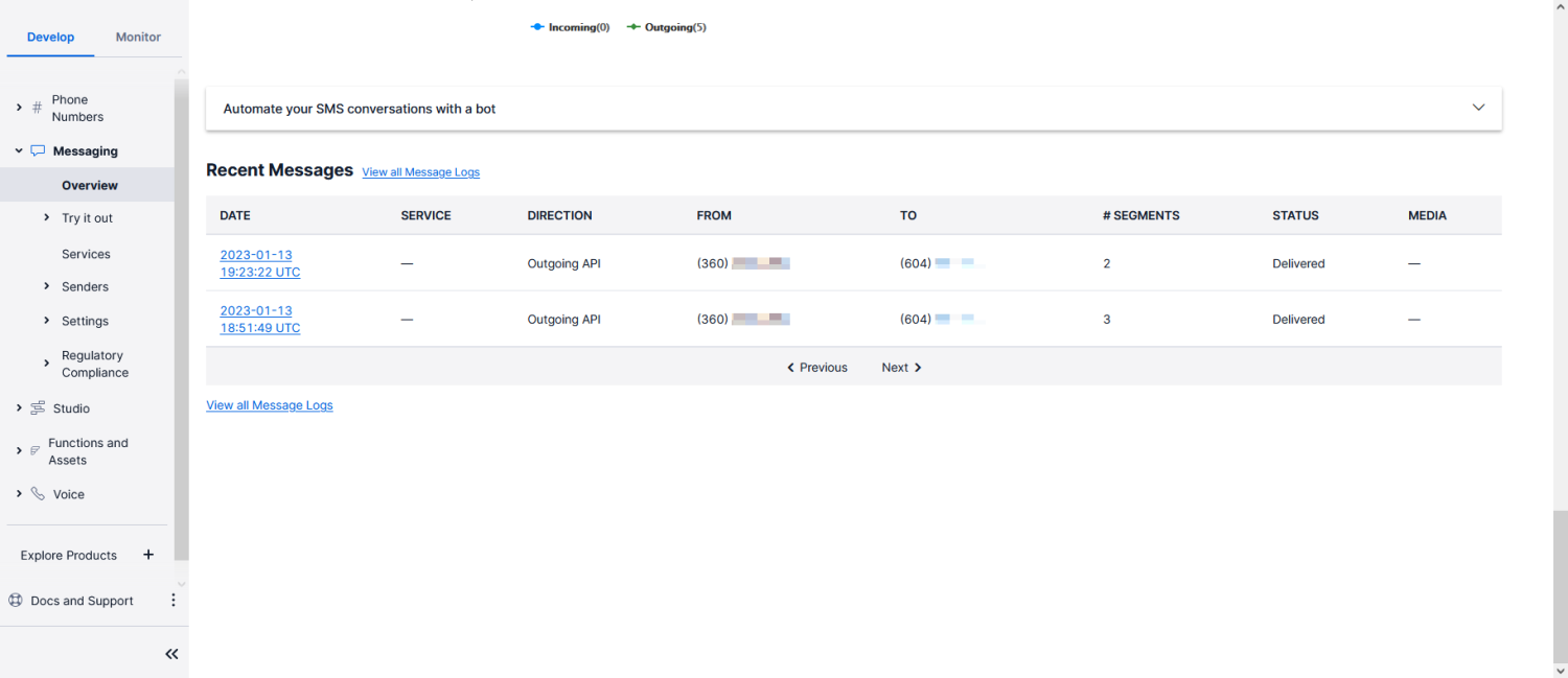 From the Twilio dashboard, go to Messaging > Overview and verify the Recent Messages section to confirm that the SMS text message was delivered.