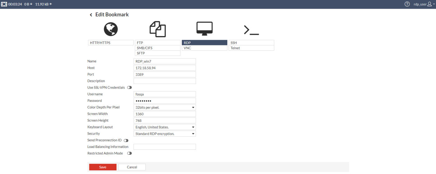 The RDP display size (width and height settings) can be customized for SSL VPN web mode when creating a new connection or bookmark. Administrators can also specify the display size when preconfiguring bookmarks.