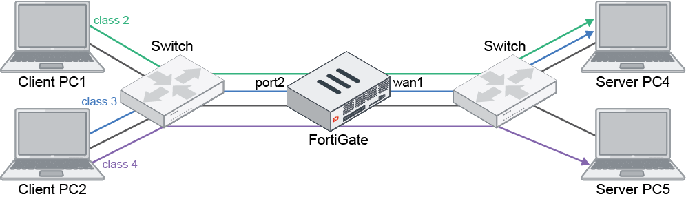 config firewall shaping-policy edit 2 set name "shaping policy 2" set service "ALL" set dstintf "wan1" set class-id 3 set srcaddr "pc2" set dstaddr "pc4" next end - Configure a policy to assign traffic from PC2 to PC5 in class 4:
