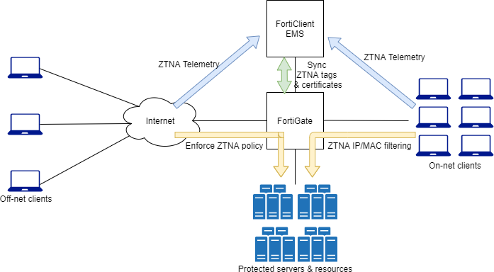 When On-net and Off-net FortiClient endpoints register to FortiClient EMS, device information, log on user information, and security posture are all shared over ZTNA telemetry with the EMS server. Clients also make a certificate signing request to obtain a client certificate from the EMS that is acting as the ZTNA Certificate Authority (CA).