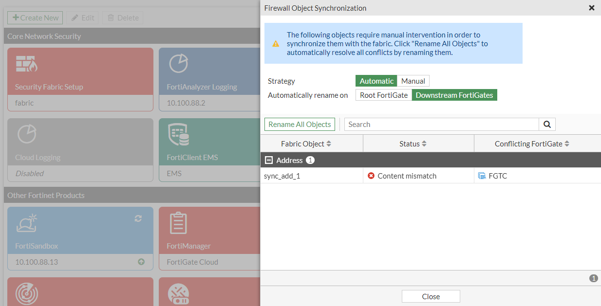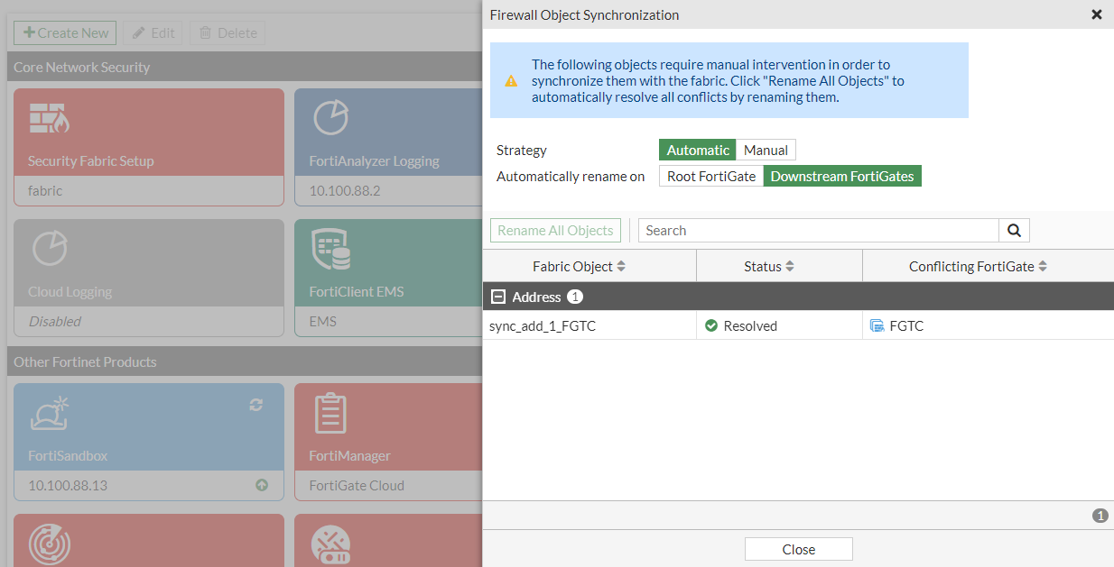 - Click Rename All Objects. The conflicted object will be renamed on the downstream FortiGate.