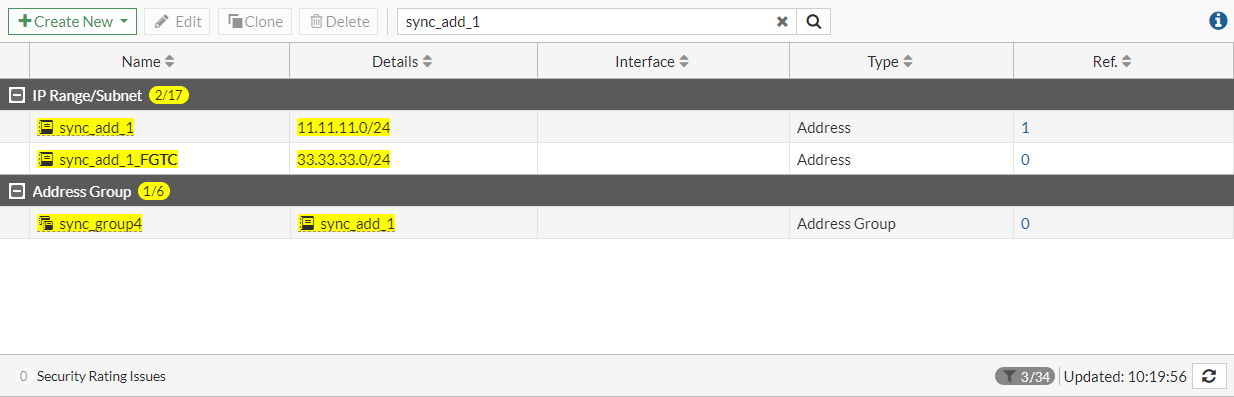- Search for sync_add_1. The original firewall address sync_add_1 was renamed to sync_add_1_FGTC by resolving the conflict on FGTA-1. The address sync_add_1 and address group sync_group4 are synchronized from FGTA-1.
